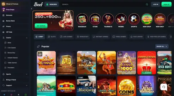 Beef online kaszinó több mint 10 000 címet kínál, nyerőgépek, élő osztós játékok, RNG-alapú asztali játékok, crash játékok és számjátékok (például kenó és bingó) vegyes kínálatával. Fő szolgáltatóink közé tartozik a Pragmatic Play, a NetEnt, a Play'n GO, az Evolution, a Hacksaw Gaming, az Amusnet Interactive, az Endorphina, a Yggdrasil, a 3 Oaks Gaming és a NoLimit City.
