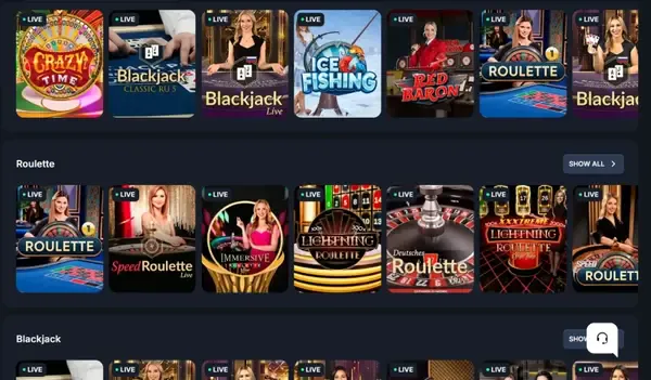 - Asztali játékok: Blackjack, Rulett, Baccarat és változatok