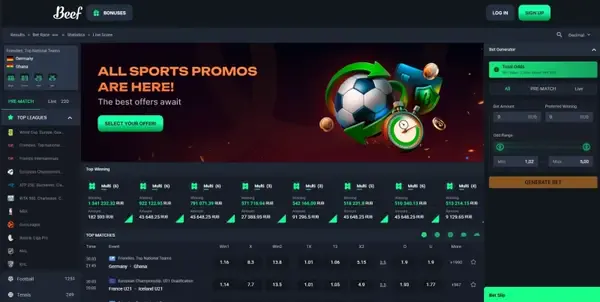 A sportfogadóknak a Beef egy Sport Üdvözlő Csomagot kínál, amely három free bet részből áll, összesen akár 50 EUR értékben. Ezt azoknak terveztük, akik kontrollált kockázattal szeretnék felfedezni az esemény előtti és az élő piacokat. Minden lépés és feltételei a sportfogadási bónuszpanelen láthatók, beleértve a tét szabályait és az egyes free betek felhasználási idejét.
