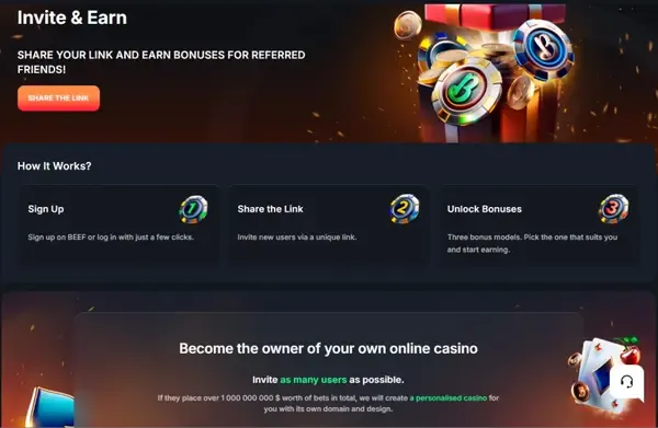 A Beef Kaszinó bónuszrendszere három részre épül: egy több lépcsős üdvözlő ajánlatra, heti promóciókra és a rendszeres játékot jutalmazó hosszú távú előnyökre. Választhatsz kaszinójátékok és sportfogadás között, és mindkét területnek saját üdvözlő útvonala van. Emellett egy négyszintes hűségprogramot is futtatunk, amely extra előnyöket ad, ahogy befizetésekből és játékból státuszpontokat gyűjtesz. Ha a kiszámítható értéket kedveled, a rakeback program kategóriánként fix részesedést térít vissza a tétekből (Nyerőgépek 7%, Élő 4%, Asztali 2%).