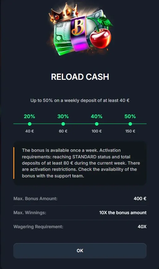 | Heti Reload Bónusz | 50% akár 400 EUR-ig vagy heti 180 ingyen pörgetés | Befizetés 20 EUR-tól; a megforgatás a promószabályokban szerepel; a lejárat és a jogosult játékok az opt-in előtt fel vannak tüntetve |