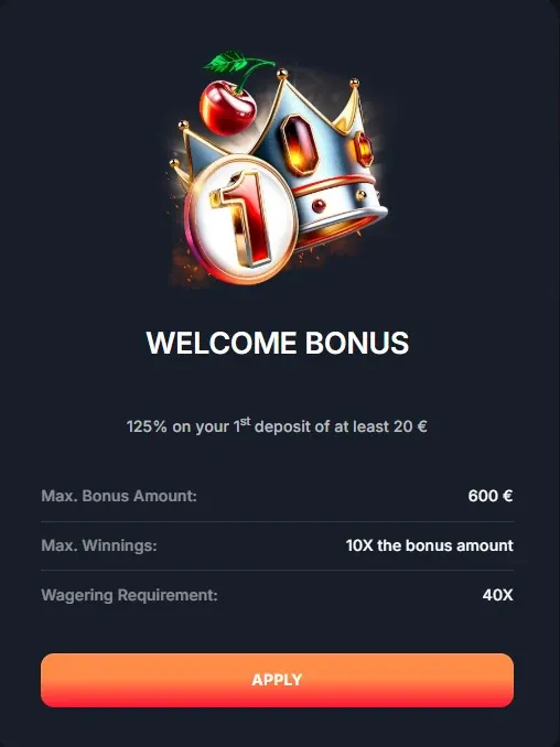 Az üdvözlő bónusz egy első befizetéses jutalom, amely a befizetés után extra egyenleget és ingyen pörgetéseket ad. A Beef Casino esetében a kaszinós üdvözlő ajánlatunk egy háromrészes csomag: 250% akár 900 EUR-ig + 600 ingyen pörgetés, 20 EUR minimum befizetéssel és 45x megforgatási követelménnyel. Külön Sport Üdvözlő Csomagot is kínálunk: egy háromrészes free bet csomagot, összesen akár 50 EUR értékben.